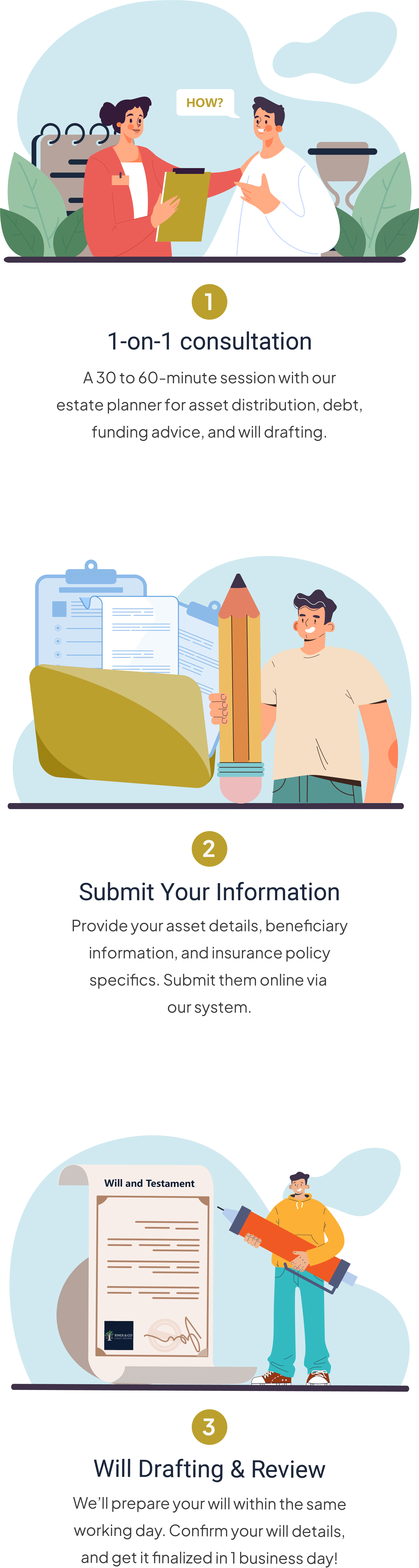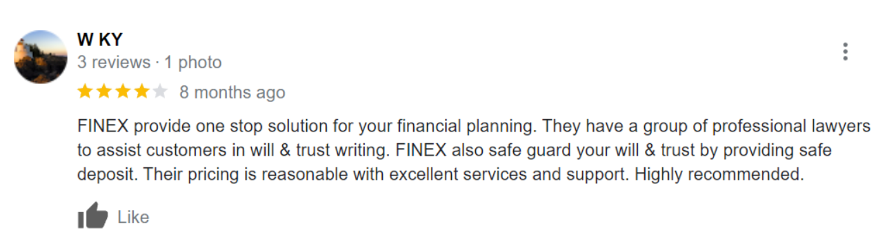 Unlike the traditional method of submitting hard copies and having to wait 2 weeks for the will to be completed, Finex & Co offers a much simpler solution. Upload documents online, receive expert advice, and get your will completed in just 24 hours.