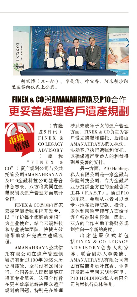 Finex & Co is responsible for setting up wills and trusts, while Amanah Raya oversees enforcement.