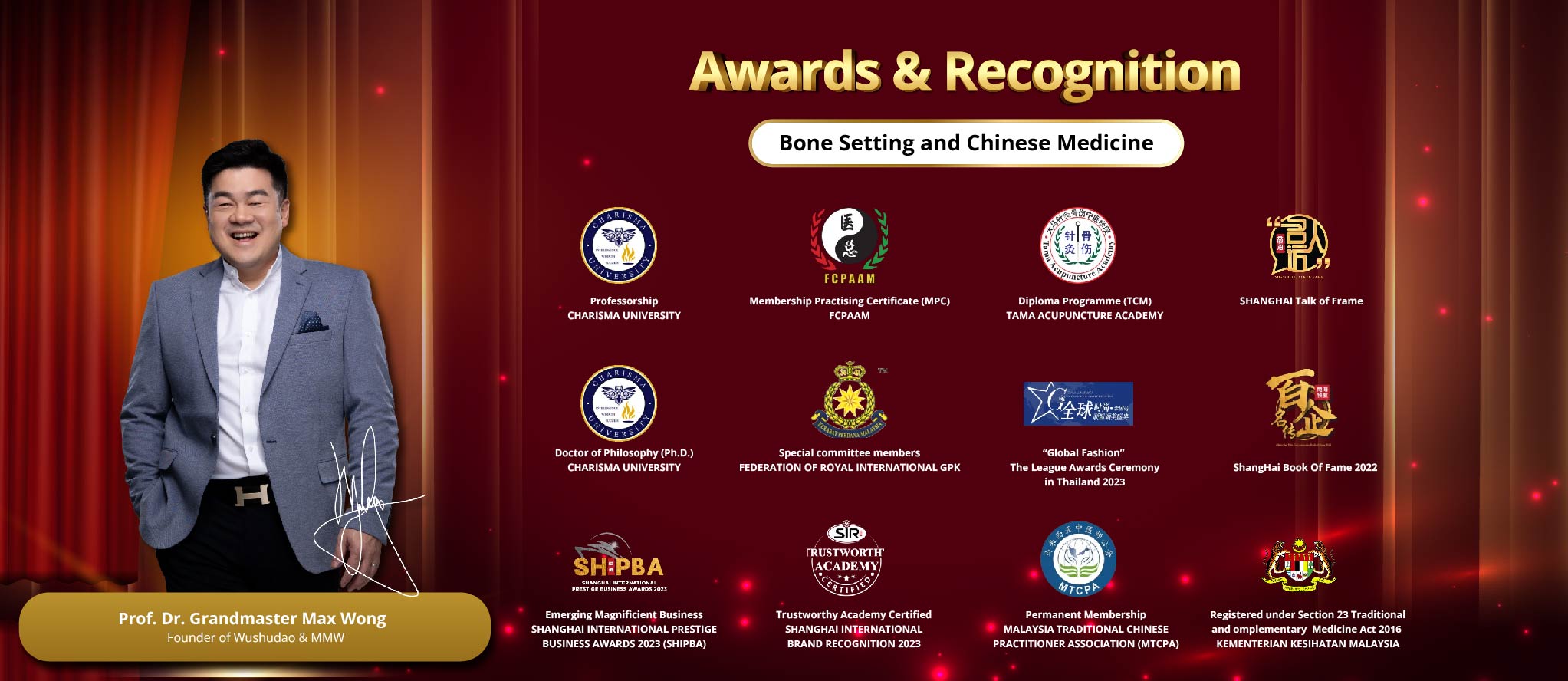 Founded by the esteemed Prof. Dr Grandmaster Max Wong, MMW is an innovative bone alignment centre in Malaysia, pioneering the blend of martial arts teaching, Traditional Chinese Medicine and innovative bone-setting techniques. It has made a unique name for its unique services that cater to quick relief, effective treatments and non-invasive methods that require no medicine or surgery.
