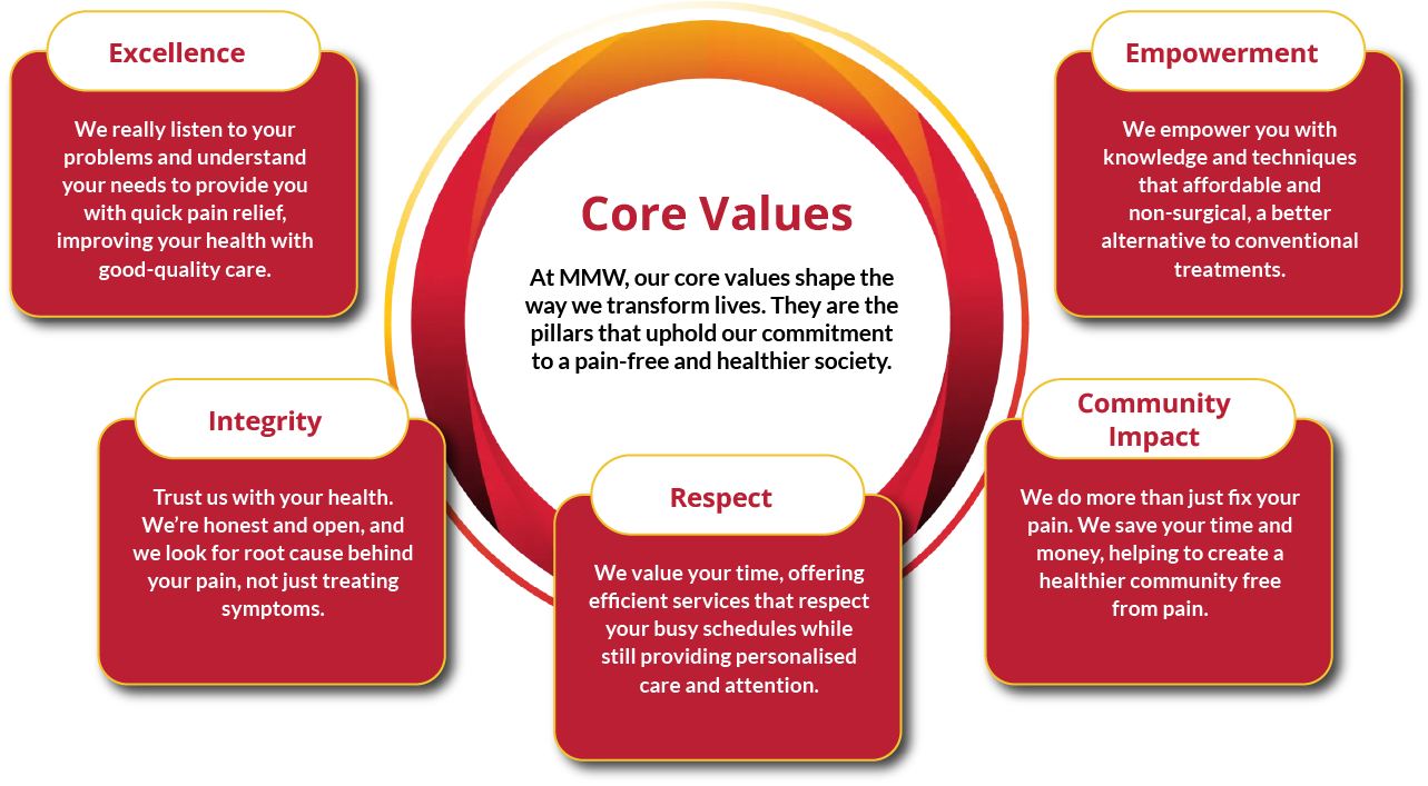 MMW, founded by Prof. Dr. Grandmaster Max Wong, is a Malaysian bone alignment center blending martial arts, Traditional Chinese Medicine, and non-invasive treatments for quick pain relief. Specializing in medicine-free solutions, MMW enhances both personal and corporate wellness.